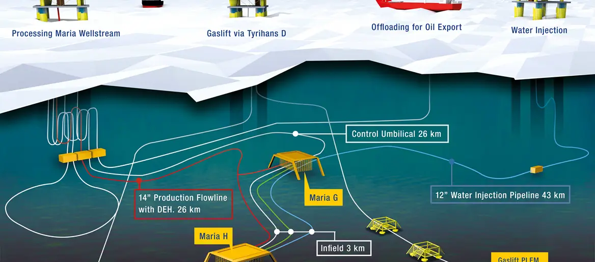 Under the approved development solution, the Maria reservoir will be linked via a subsea tieback to the Kristin, Heidrun and Åsgard B production platforms. The Maria well stream will go to the Kristin platform for processing while supply of water for injection into the reservoir will come from the Heidrun platform and lift gas will be provided from Åsgard B via the Tyrihans D field subsea template. Processed oil will be shipped to the Åsgard field for storage and offloading to shuttle tankers. Gas will be exported via the Åsgard Transport System to Kårstø.