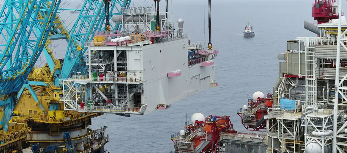 Gassbehandlingsmodulen for Dvalin løftes om bord på Heidrun. Foto: WintershallDea