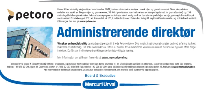 Styret i Petoro går aktivt ut og søker kandidater til stillingen som administrerende direktør etter Kjell Pedersen som går av med pensjon i midten av juni. Rekrutteringsselskapet Mercuri Urval er valgt til å bistå styret i rekrutteringsarbeidet og stillingen blir også annonsert. Interesserte kan ta kontakt med Mercuri Urval - klikk på annonsen eller linken nedenfor for å se kontaktdetaljer.